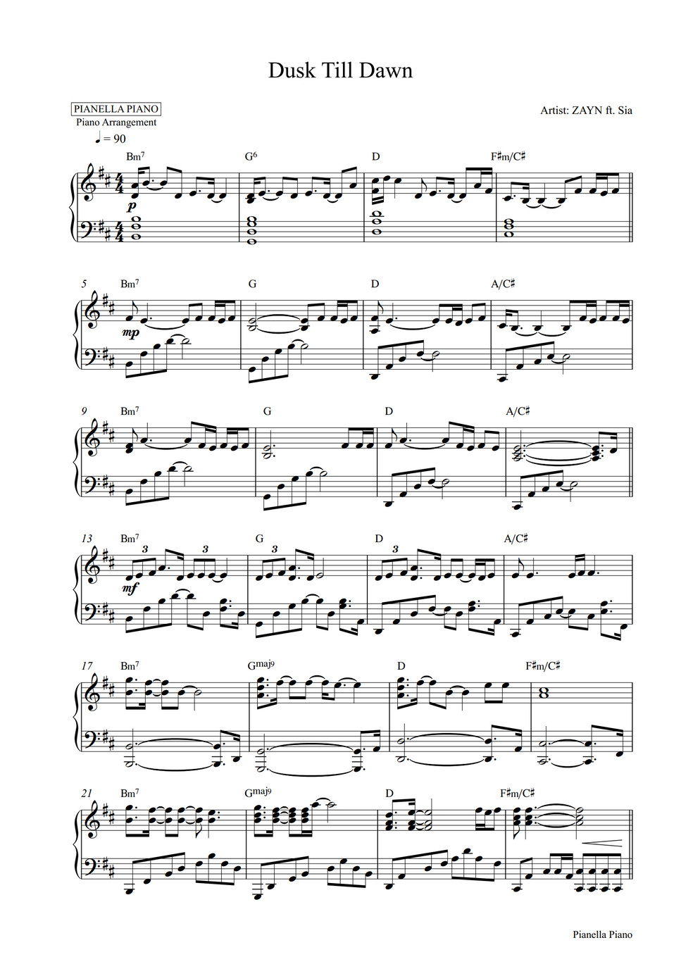 Zayn Ft Sia Dusk Till Dawn Piano Sheet By Pianella Piano Sheet